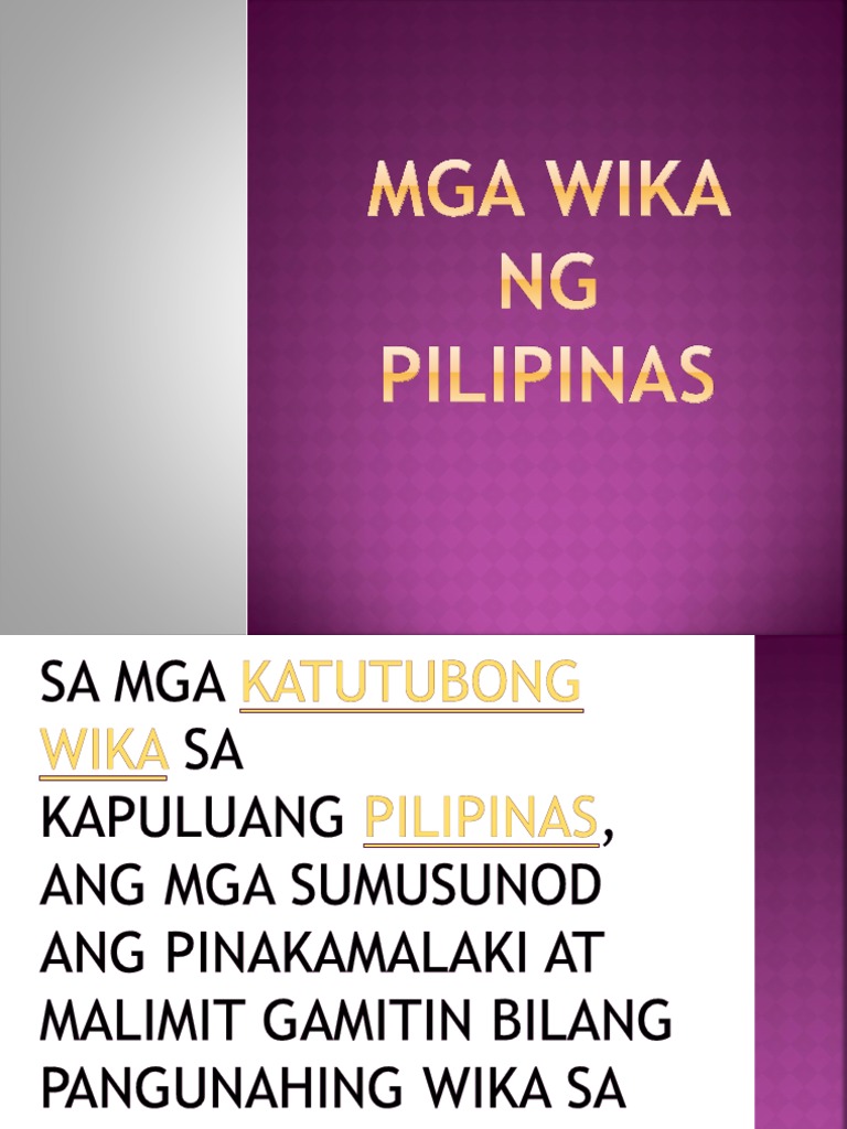 Ano ano ang mga pangunahing wika sa pilipinas. Mayroong 175 wika sa Pilipinas 171 dito ay nanatiling gamit pa at 4 ay tuluyang lumipas na. Para mas maging pino mapagyaman madagdagan at manatiling buhay. 19082014 Isa lamang ang kinatawan.